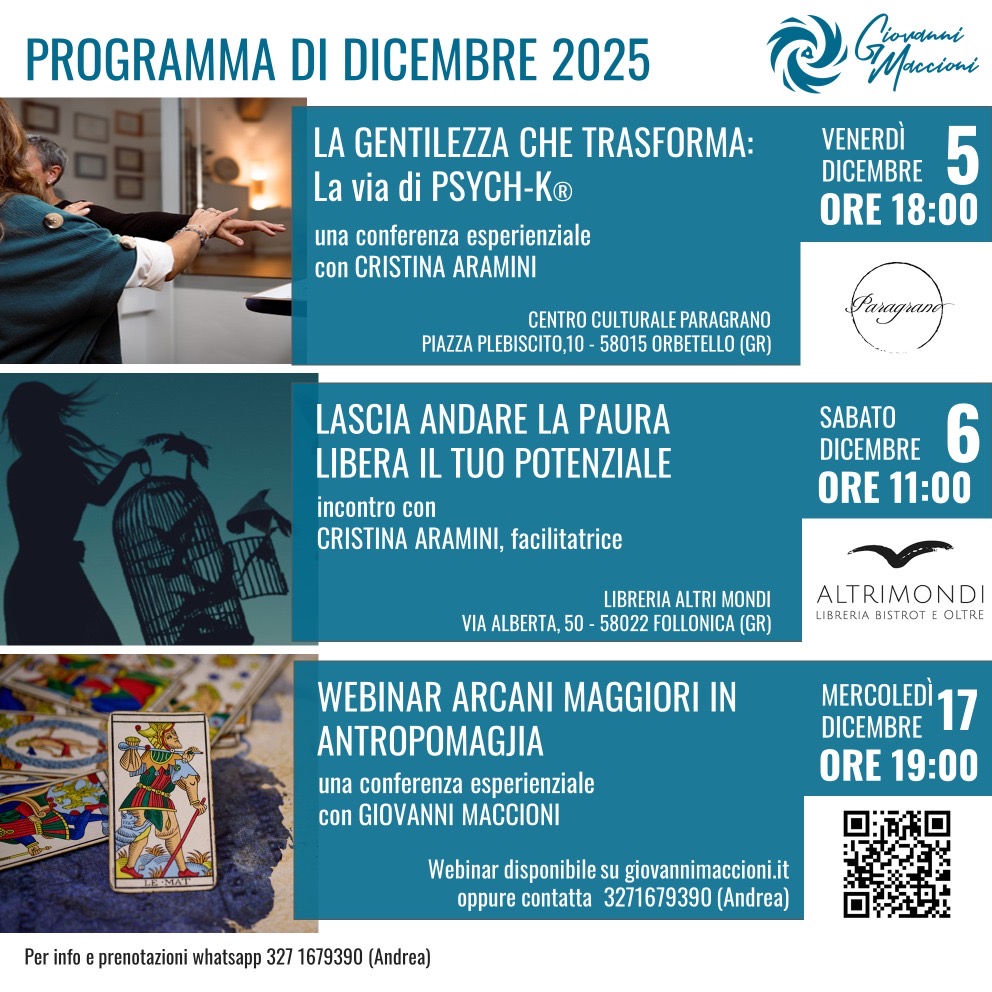 Ecco a voi gli appuntamenti in calendario per il mese di dicembre che vedrà la presentazione di due conferenze esperienziali ad Orbetello e a Follonica su un tema di grandissimo interesse: PSYCH-K® e un secondo webinar in programma per il giorno 17 nel quale parleremo di Arcani Maggiori in Antropomagjia. Appuntatevi le date!